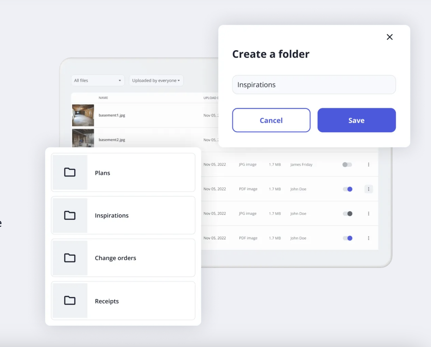 By default, Billdr PRO will create folders for invoices, quotes, change orders, expenses, and daily logs. You can also easily share a folder or file with anyone via a public link.
