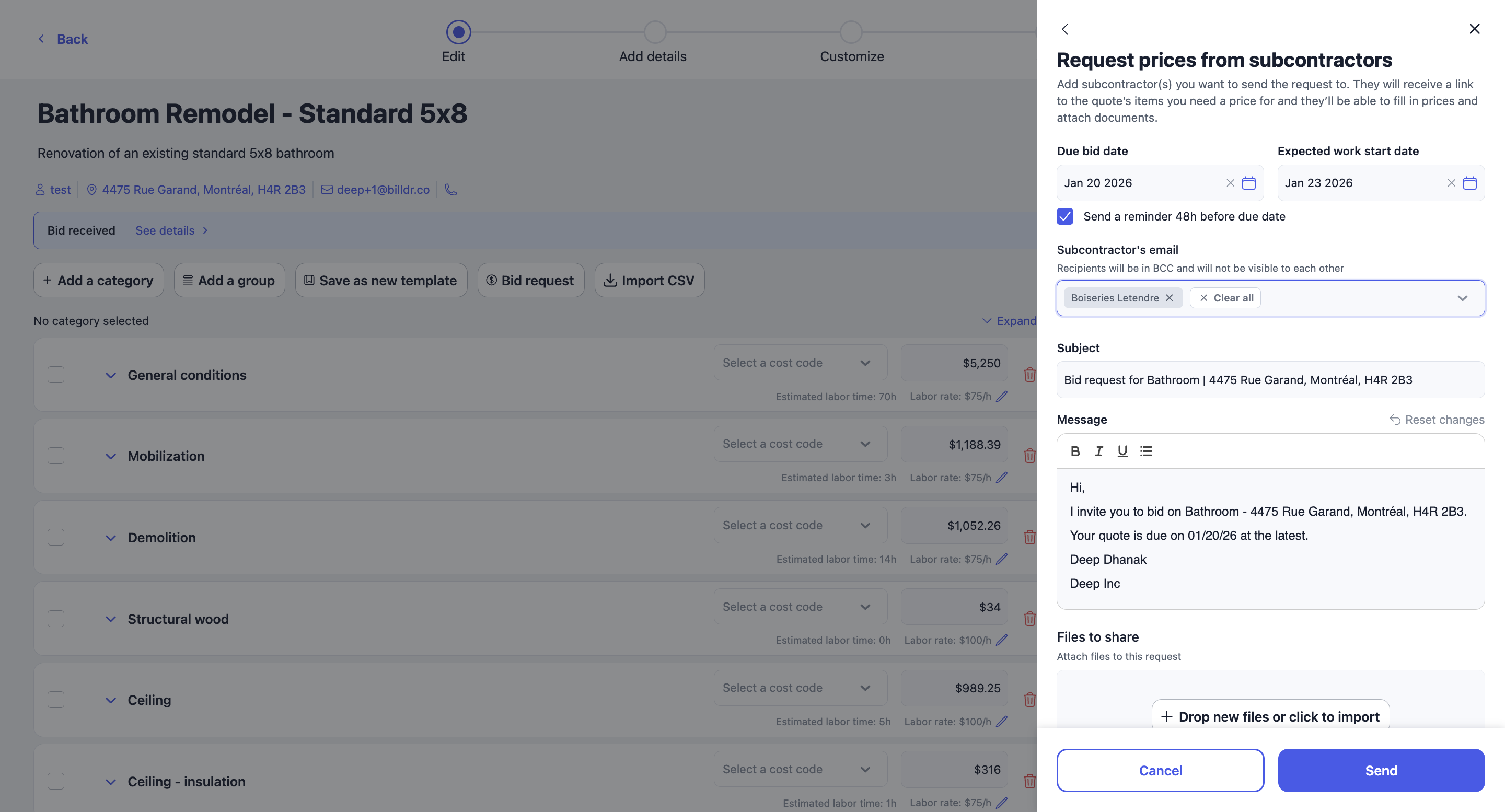 👉 If your subcontractor has already submitted their price and forgot to include some items, they will need to resubmit a new price, and you will need to resend them a bid request.