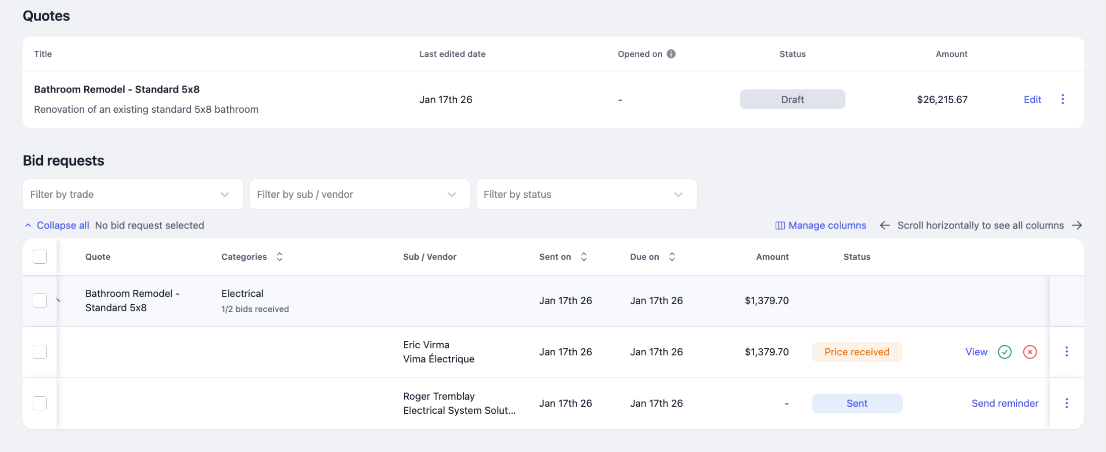 All bid requests are automatically tracked in one place under the Quotes tab within a project