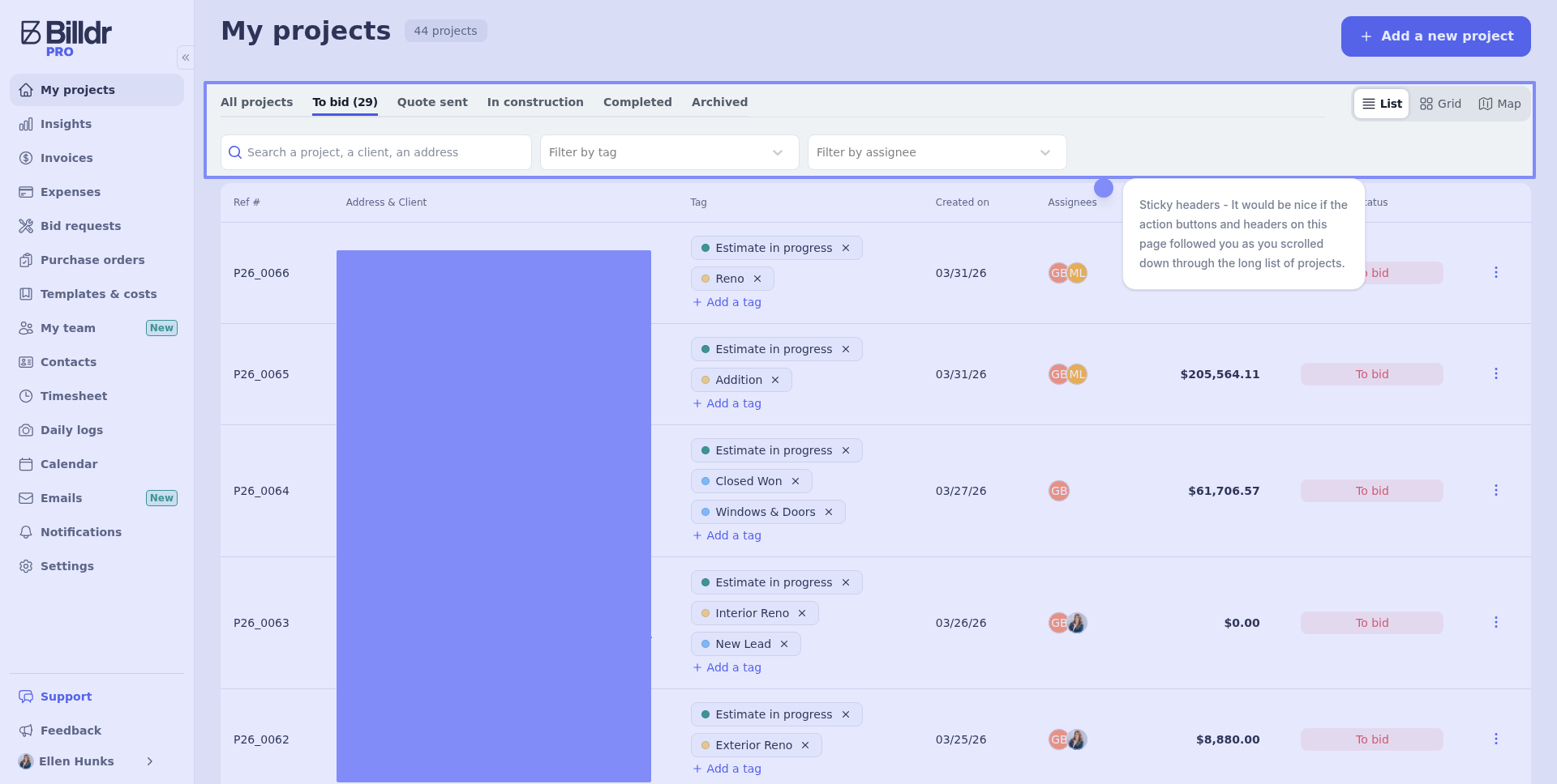 It would be great if in the admin portal and web version of the app, on the ‘My Projects’ page, the action buttons, filters, and search box were sticky and followed you as you scrolled down through the list. Making it simpler to jump from scrolling to finding the right project in a long list.