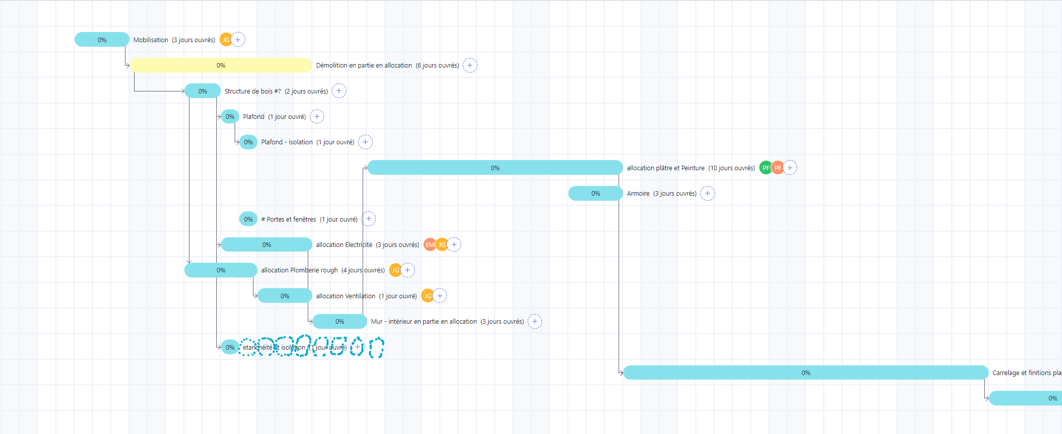 being able to mark task as fixed/unfixed and ranged . I have a subcontractor that have not confirmed a date but we know that he need 1 day and it need to be between date A and date B and we know itβs predecessor and successor. it could apprear in gray or in dot like in the picture here. this could also be use to differentiate work that could change with little consequence(unfixed). versus work that have an immovable deadline(fixed). by example cabinet installation that will cause a 2 to 4 week delay if needed to be rechedule versus mdf molding installations or backsplash that is done by our company employe that can be reschedule without any consequence as long as this is between date A and B(unconfirmed with date range). when marked as work complete the unconfirmed or movable task will be moved accordigly to predecessor and succesor task and delay but fixed date task will remain at the same spot.